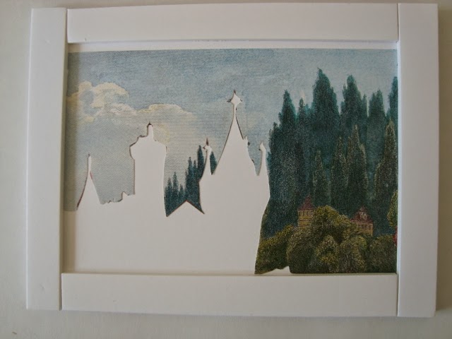 Glue the background onto a piece of card and then glue strips of foam board around the edges to affix the next raised layer.